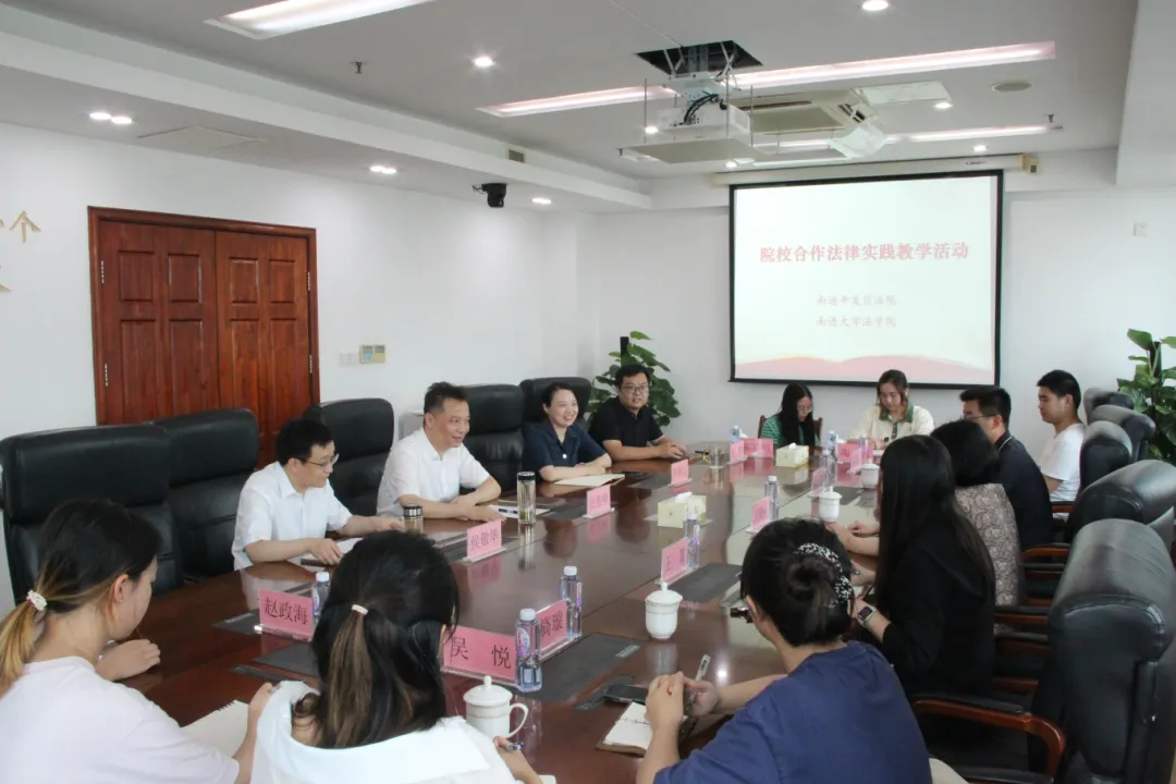 7月1日下午,依据签订的《教学实践基地共建协议书》,yl8858永利集团yl88858永利中国(法学院)与南通开发区法院举办学生暑期法律实践教学活动。yl8858永利集团yl88858永利中国(法学院)副院长王晓燕,院长助理、法律系主任王菁,法律系副主任靳匡宇,院党组书记、院长任智峰,院党组成员、政治部(督察室)主任侯敬华出席会议,院党组副书记陈颖之主持会议。