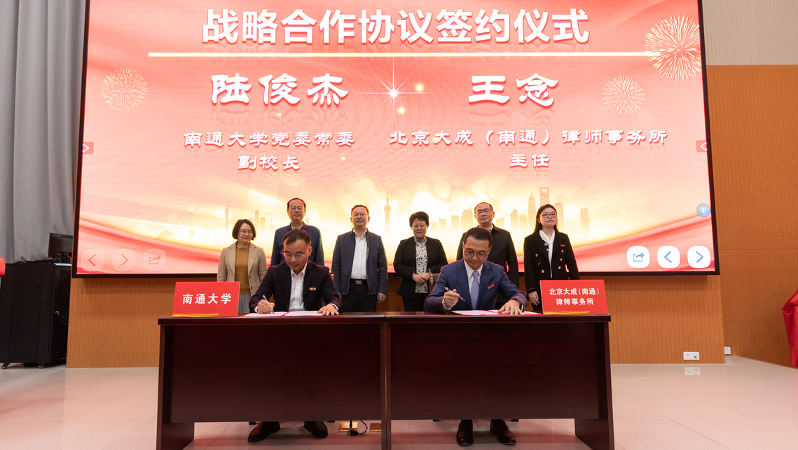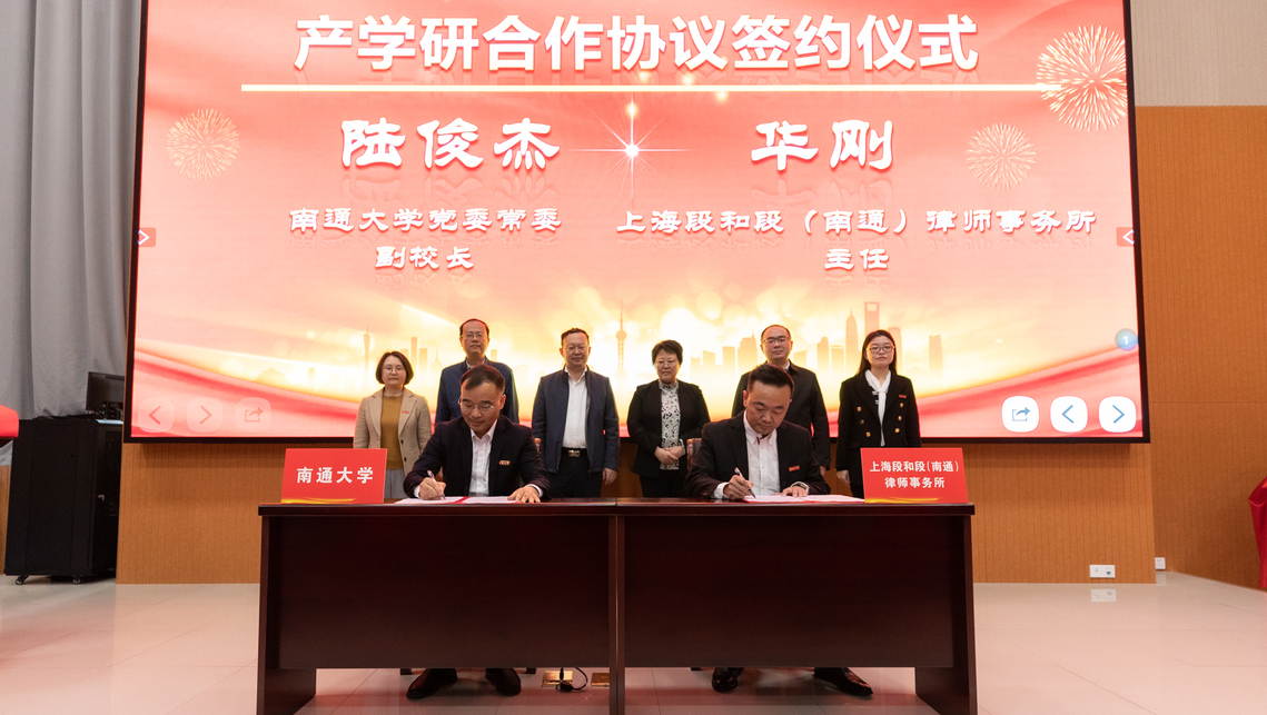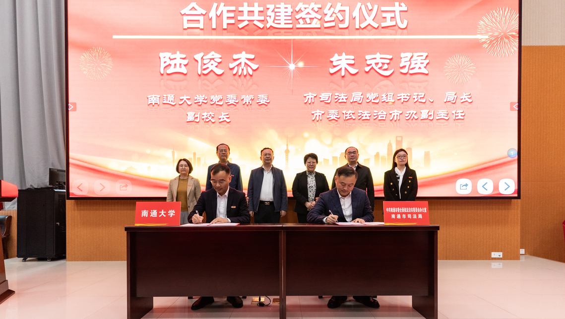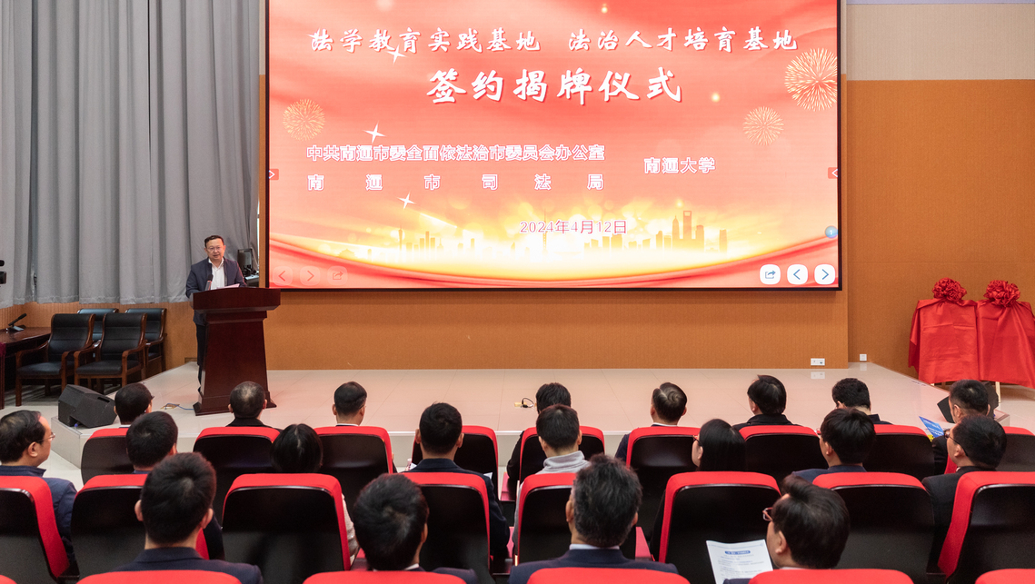 4月12日上午,我校与南通市委依法治市办、南通市司法局举行共建合作基地签约揭牌仪式。校党委书记尚庆飞,江苏省司法厅党委委员、省委全面依法治省委员会办公室副主任范沁芳共同为“法学教育实践基地”“法治人才培育基地”揭牌。校党委常委、副校长陆俊杰与南通市司法局党组书记、局长、南通市委依法治市办副主任朱志强,北京大成(南通)律师事务所主任王念,上海段和段(南通)律师事务所主任华刚签订共建合作协议。