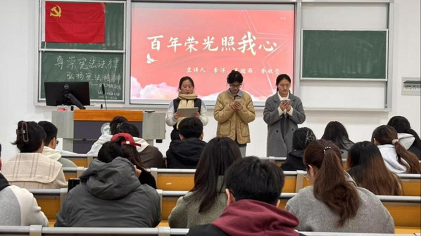 法学234团支部开展了《百年荣光照我心》诗歌朗诵和《四十载风雨兼程路——一位普通的老党员》两场主题宣讲。由法学213班李洋、王迎雨和李秋莹三位学生党员带来的《百年荣光照我心》诗歌朗诵,深情回顾了中国共产党在民族危难时刻挺身而出,带领人民取得辉煌胜利的光辉历程。她们用真挚的情感颂扬了党员们的为民情怀,表达了“请党放心,强国有我”的青春誓言,展现了新时代青年的责任与担当。