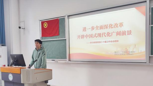 法学232团支部开展了《探索革命忆峥嵘,继往开来向新程》和《开辟中国式现代化广阔前景——学习领悟党的二十届三中全会精神》两场主题宣讲。学生党员、法学213班乔冠骎和蔡沁钰携手引领同学们探索红色资源,重温革命历史。蔡沁钰详细阐述了三大标志性革命根据地的历史背景和发展脉络,乔冠骎则特别聚焦井冈山革命根据地的法制构建,深入解析其对中国革命的重要意义。两位主讲人通过生动的讲述,激发了同学们保护红色资源的责任感,增强了他们对革命历史的深刻认识,激励新时代青年肩负起传承红色文化的重任,发出属于新时代青年的最强音。