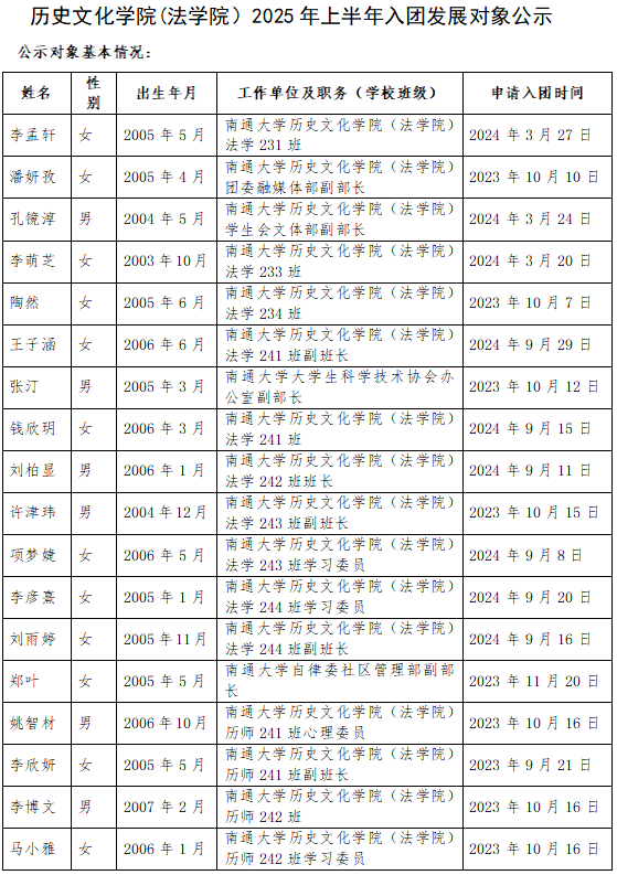 经征求团员群众意见,团支部集体研究,拟将李孟轩等18名同学确定为入团发展对象,现予以公示。公示时间:2025年4月11日至2025年4月15日。如公示对象存在问题,欢迎广大团员群众通过来电、来信、来访反映。以个人名义信函反映问题提倡署真实姓名。联系人:马策,联系电话:17515289800。