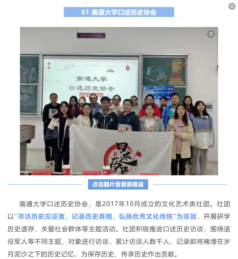 在团中央基层建设部的指导下,由中国青年报社主办的2023—2024学年高校“活力社团”风采展示活动中,我校口述历史协会凭借其卓越的表现和独特的育人功能,成功入选并将在活动中进行风采展示!