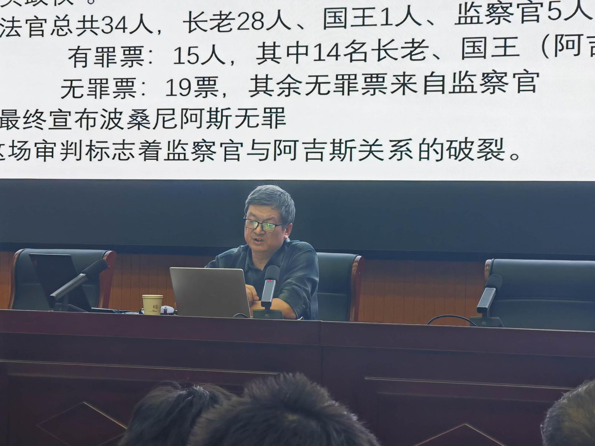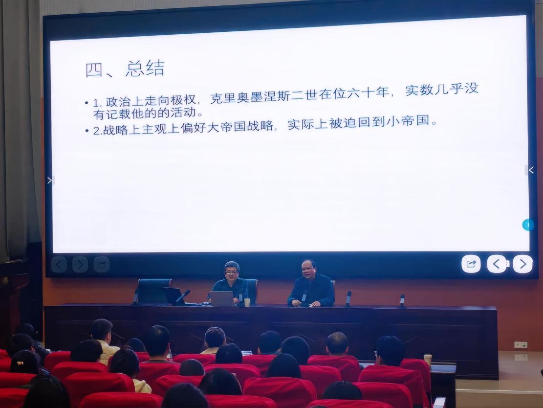 祝宏俊教授围绕斯巴达帝国初期的权力格局与战略分歧展开论述,他梳理了伯罗奔尼撒战争后,阿吉亚德、欧律彭提德两大家族及海军势力的角逐,解析了以阿吉斯、莱山德为代表的“大帝国派”称霸希腊世界的战略诉求,与波桑尼阿斯为代表的“小帝国派”坚守本土盟主地位的主张分歧,点明波斯干预、集团利益纠葛及海军势力摇摆是冲突激化的关键因素。对此,祝教授进一步指出,这场权力与战略之争是导致斯巴达由盛转衰的分水岭,这让在场师生对古希腊城邦政治形态有了更为深刻的认知。